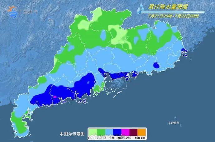 7月21日,湛江、茂名和阳江有暴雨到大暴雨,云浮、珠三角南部和粤东有大雨到暴雨局部大暴雨,其余市县有中到大雨局部暴雨。最高气温:全省大部分市县介于28~31℃。