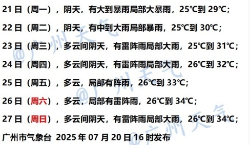 广州市气象台预计,21日受“韦帕”外围环流影响,广州仍有大到暴雨局部大暴雨,陆地和港区风力逐渐减弱。7月22日受偏南气流影响,广州有中到大雨局部暴雨。7月23日天气仍不稳定。